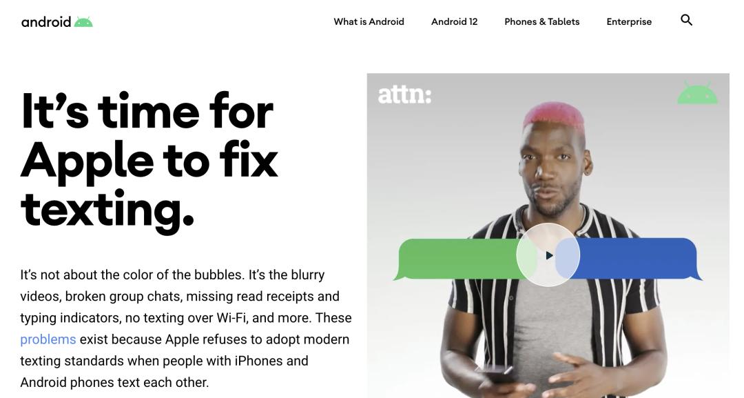 用手机发个信息,咋还整出来这么多幺蛾子?最近,谷歌终于按捺不住,直接在安卓官方网页上线了一个炮轰网站:苹果是时候修复短信了!