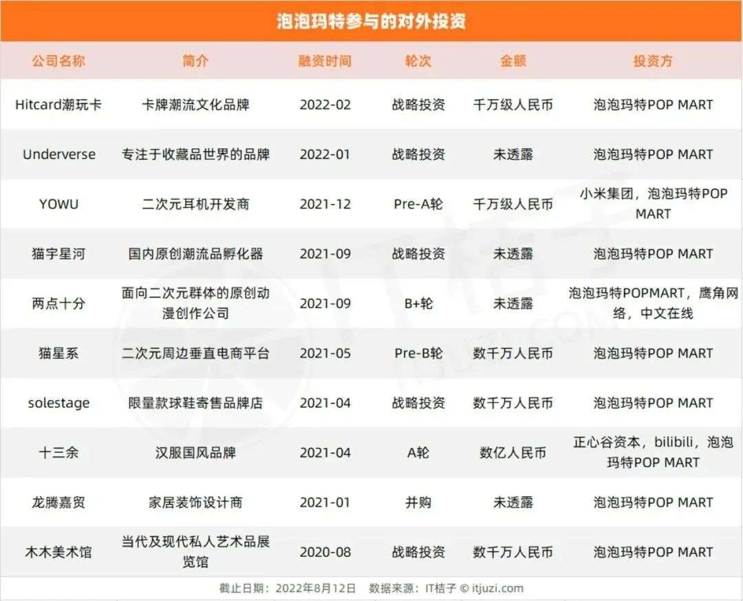 另外,从对外投资公司来看,IT 桔子数据显示,泡泡玛特自 2020 年以来出手频繁,投资过的公司超 10 家,涉及艺术品展览馆、国风服饰、二次元耳机等。值得注意的是,这些投资中超一半以上的投资均为泡泡玛特独立投资。