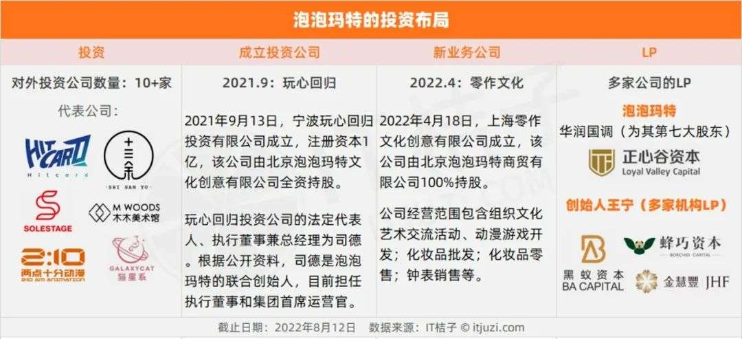 2021 年 9 月 13 日,由泡泡玛特控股的宁波玩心回归投资有限公司成立,注册资本 1 亿元。随后,玩心回归于 2022 年 1 月投资了专注于收藏品世界的品牌的暗星文化(UNDERVERSE),持股该公司 15.3603% 的股份。不管是出于多元化布局的考量,还是为获投资回报,玩心回归的成立,代表着泡泡玛特有意加强自身护城河建设。