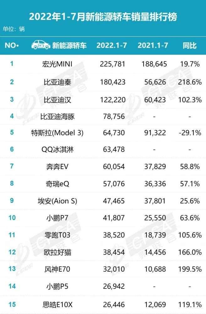 在乘联会最新公布的2022年1-7月新能源汽车销量排行榜上,东风汽车集团旗下的风神E70排在第13名,销量达32,010辆,同比增长199.5%。