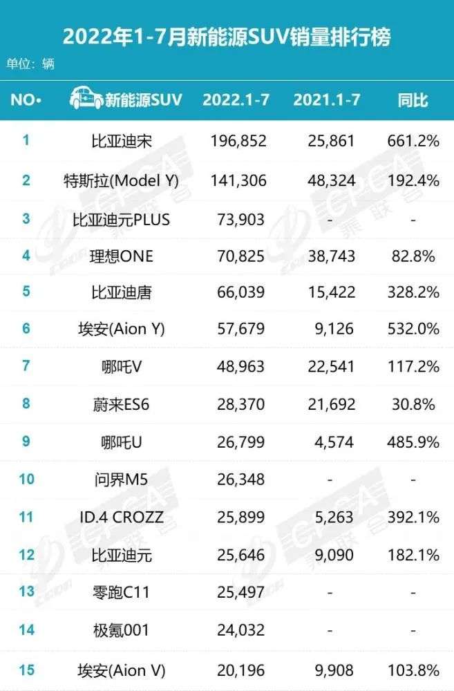 在乘联会最新发布的2022年1-7月新能源SUV销量排行榜上,比亚迪宋、特斯拉Model Y、比亚迪元PLUS分别位列前三,其中比亚迪宋和特斯拉Model Y的销量均超10万辆,与岚图FREE增程版对标的理想ONE排名第四,而岚图FREE并未上榜。