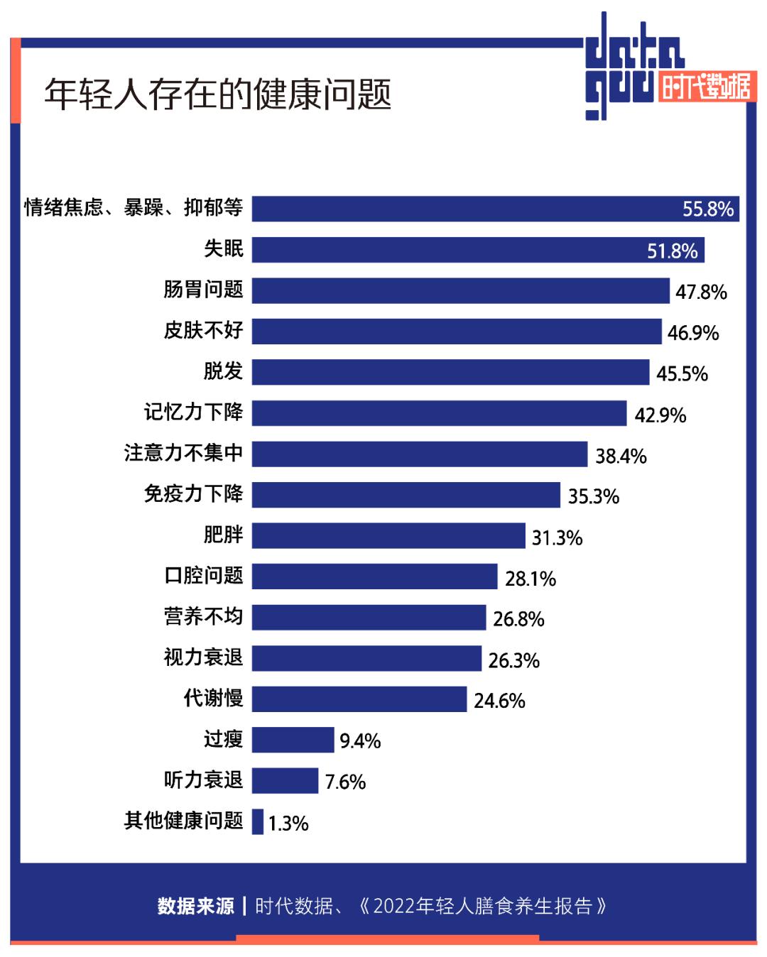 2020年《国民健康洞察报告》显示,超半数18-35岁年轻人近一年内担心过猝死,其中6%经常担心甚至每天担心。年龄越小的人越担心死亡。亿欧智库近期发布的调研显示,情绪问题、失眠、肠胃问题、皮肤不好和脱发成为年轻人首要健康问题。