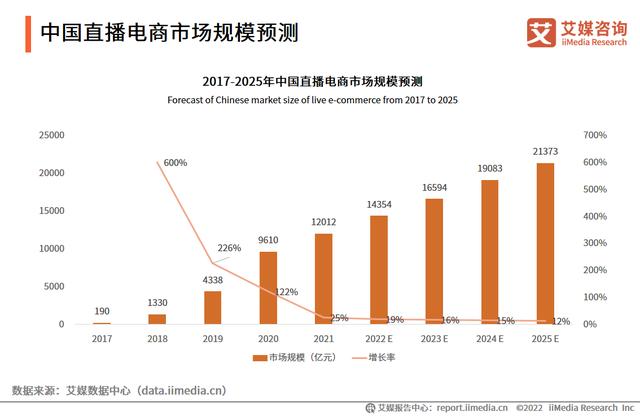 据网经社电子商务研究中心发布的《2022年(上)中国直播电商市场数据报告》预计,2022年国内直播电商交易规模可达34879亿元,同比增长47.69%。2017至2021年,国内直播电商市场交易规模分别为196.4亿元、1354.1亿元、4437.5亿元、12850亿元和23615.1亿元。