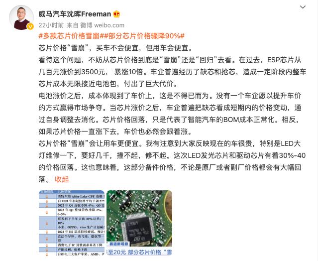 威马汽车CEO沈晖表示,芯片价格“雪崩”会让用车更便宜。“这次LED发光芯片和驱动芯片有着30%-40%的价格回落。这也意味着,这部分备件价格,不论是原厂或者副厂价格都会有大幅回落。”