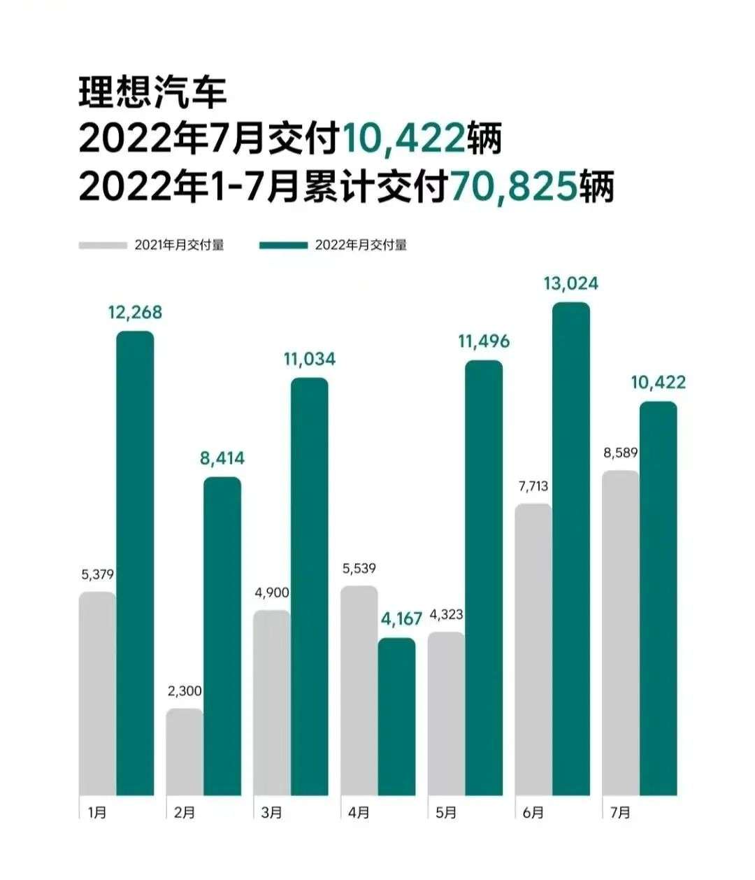 七月份理想交付10422辆理想ONE,而在六月份交付了13024辆,五月份交付了11496辆,七月份理想ONE的销量是近三个月最低。