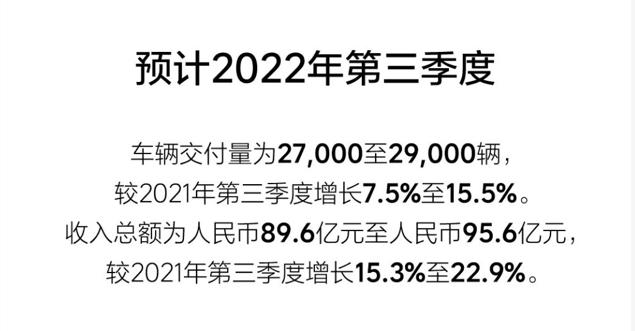 预计车辆交付量为2.7万至2.9万辆,较2021年第三季度增长7.5%至15.5%。