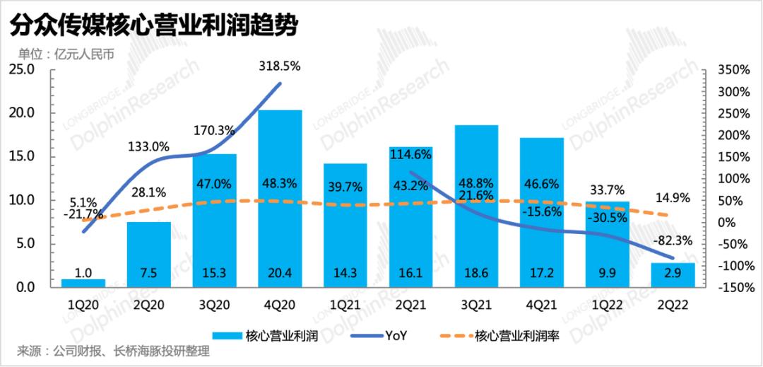 (5)最终分众在收入拉胯、强行收缩费用下,只挤出了不到3亿的核心营业利润(不包含投资收益),同比下滑超80%,这个数据还不够去年同期的个位数零头,虽有预警,但仍然惨烈。