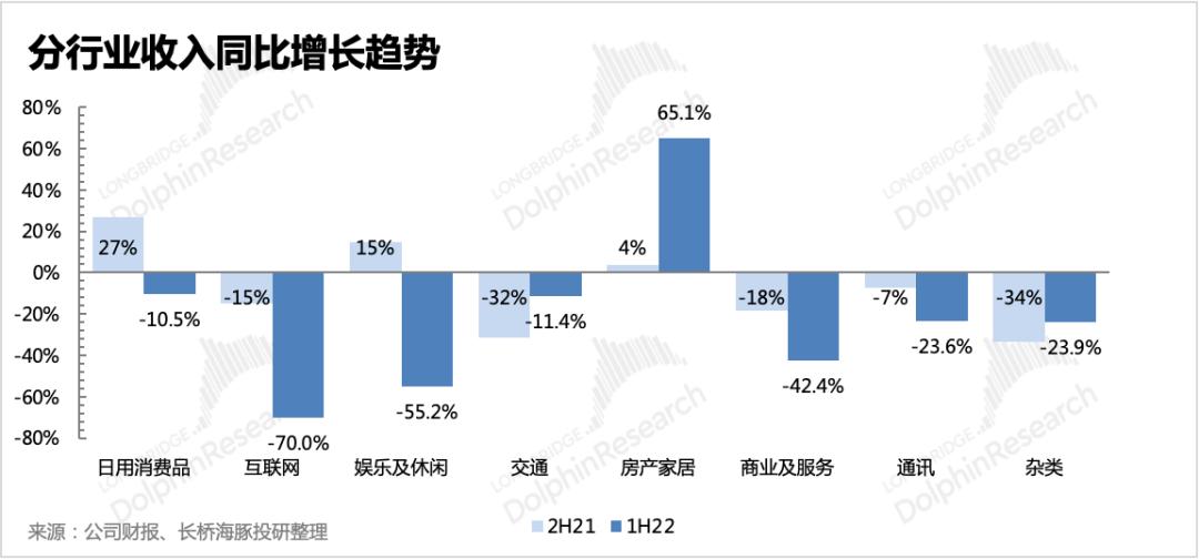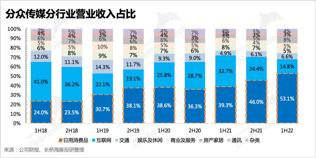 不过另一面,如果对比2H21和1H22的增速变化,会发现虽然上半年有疫情,但部分行业也有回暖迹象,比如交通、房产家居以及其他杂项。而对分众贡献最大的日用消费品行业,下滑幅度也相对有限(~下滑10%),并没有想象中的那么恐怖。