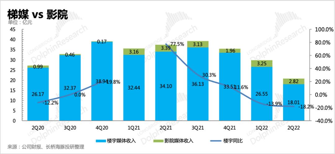 分不同产品来看,占比近94%的楼宇媒体尚有流量,收入同比下滑47%,但受到严加管控的影院广告以及其他商场户外广告,就更加悲剧了,同比下滑在70%左右。