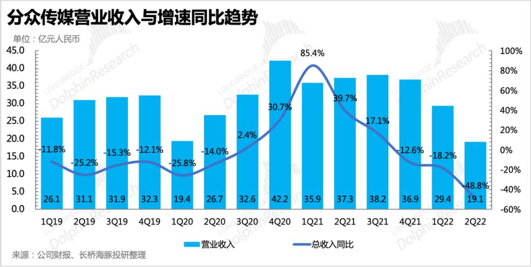 (1)二季度单季收入19.13亿元,同比下滑49%,但差得有点超出海豚君此前的预期。宏观+监管+疫情,分众成为了最受伤的那个。其中来自于互联网广告主的收入在高基数下同比下降70%,数字触目惊心。