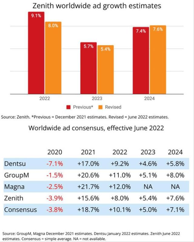 根据Zenith机构最近的预测,2022 年全球在线广告支出将增长 8%(比该机构 2021 年 12 月的预测低 1.1%)。