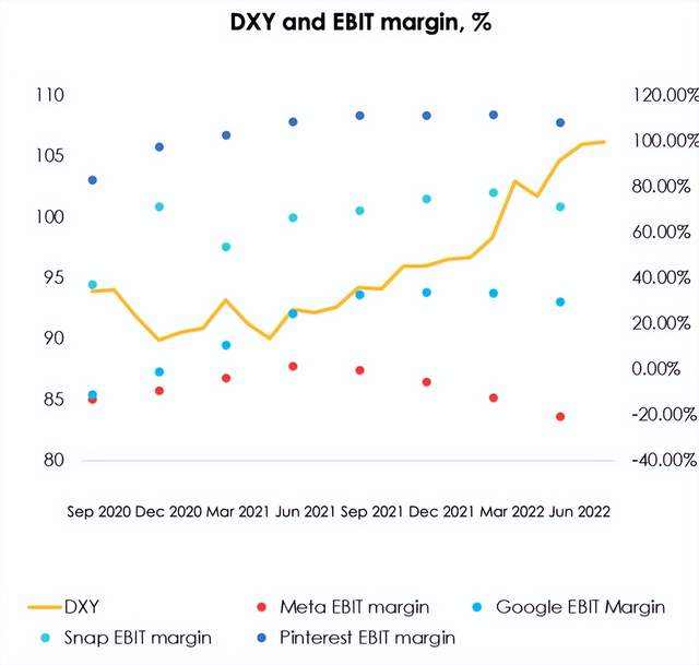 对于在全球范围内提供服务的广告公司,比如Google、Meta Platforms、Snap 等而言,另一个重要问题是目前美元兑其他货币的高汇率。