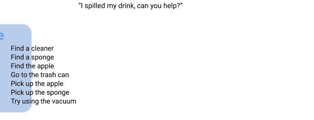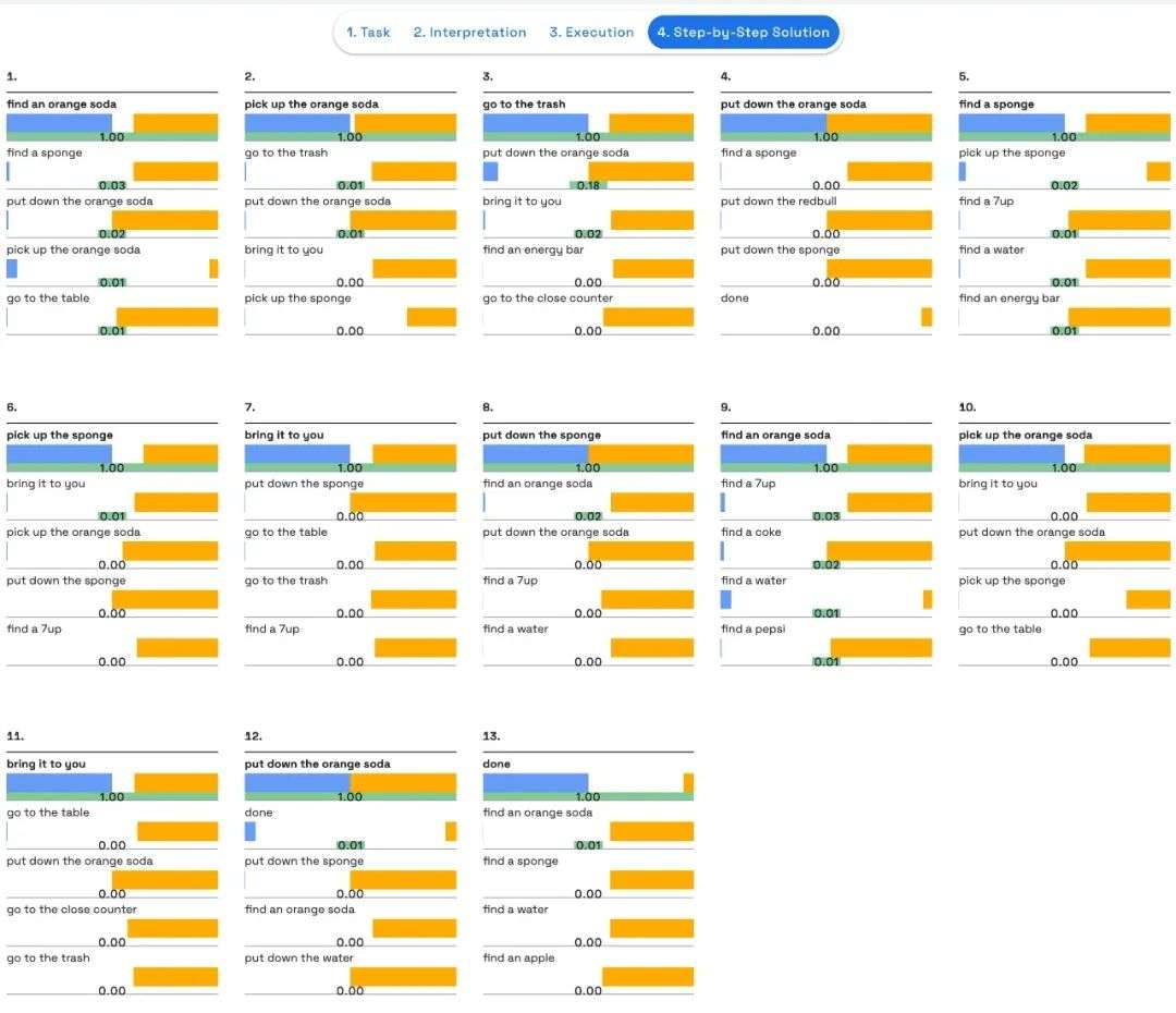 比如当你洒了饮料,请求机器人帮忙时,你可以看到它是如何做出决定,为执行任务选择最合适的步骤的:找到可乐罐,拾起可乐罐,走到垃圾桶旁边,放下可乐罐,找到一块海绵,拾起海绵,走向桌子,放下海绵……