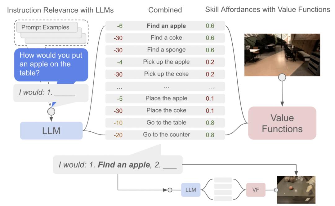 PaLM-SayCan方法将语言模型的概率和价值函数(VF)的概率相结合,以选择下一个要执行的技能,重复这个过程,直至高级指令成功完成。