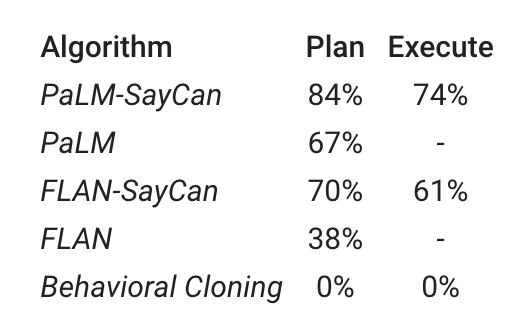 结果显示,使用带有affordance grounding的PaLM(即谷歌PaLM-SayCan)系统在84%的时间内选择了正确的技能序列,并在74%的时间内成功执行这些技能序列。