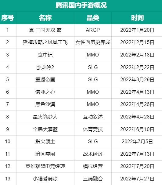 据data.ai数据显示,截至7月27日,腾讯今年在国内市场共上线了13款手游,涉及SLG、MMO、ARPG及女性向历史养成等多个品类。