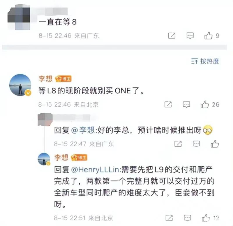 甚至李想随后在微博上公开声称:想等L8的用户,暂时就别买ONE了……