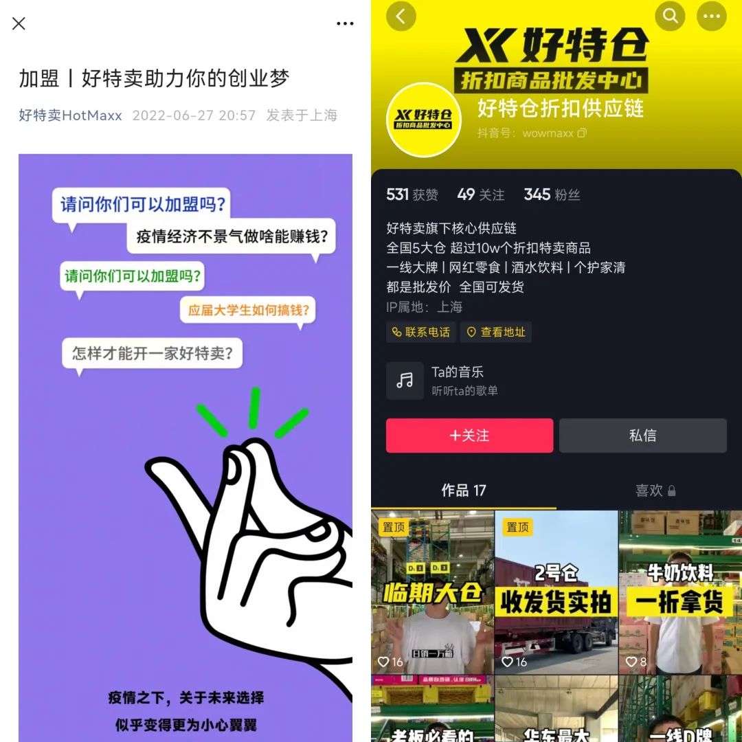 相对应的,好特卖从6月底在官方微信公众号和各社交平台发布了全面启动加盟的信息,还在抖音开设账号“好特仓折扣供应链”,面向全国开放供应链,提供各类折扣商品。
