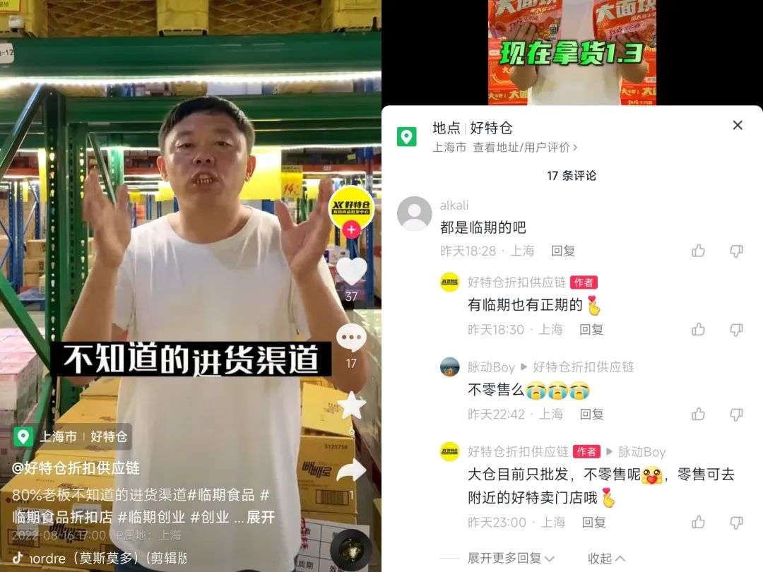 小红书、抖音和豆瓣等平台上,无数临期食品店正在刷屏,店内商品常常能达到原价的2折、3折。有人带着疑惑发问:“这么便宜是正品吗?”会有博主和网友回复,这些都是临期食品,才会打折售卖。