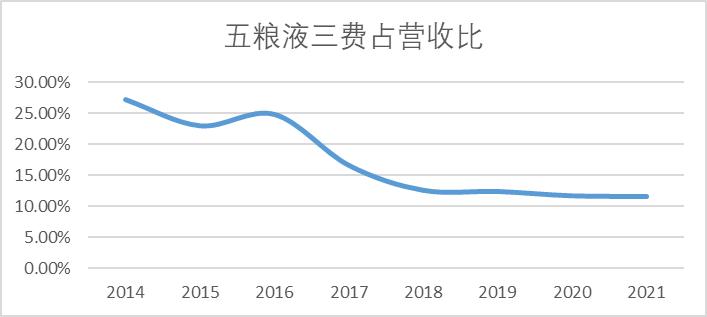 五粮液能够止血离不开酱香风潮带来的白酒行业红利,也离不开自身刮骨疗毒的魄力。销售渠道改革,前五大供应商占比从最高点78.43%下降到2021年的9.15%,加强了企业自身对下游渠道的掌控力。另外品牌线的削减也降低了企业冗杂的费用支出,五粮液的三费支出占比由2014年的27.12%下降至2021年的11.59%。已经同茅台的三费占比(9.37%)趋于一致。