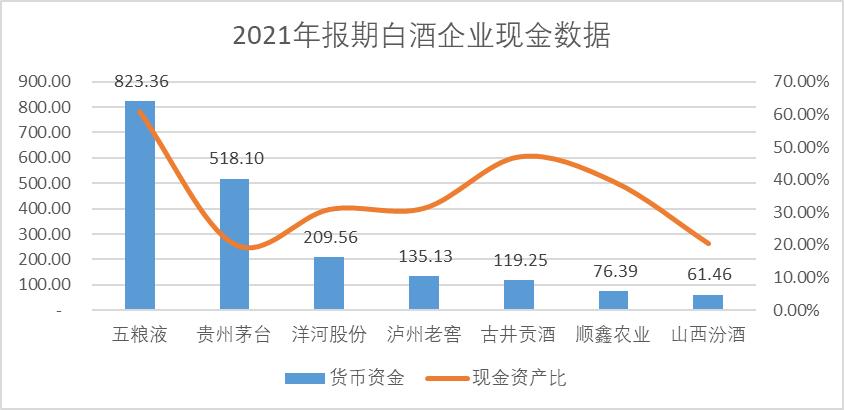 2021年年报显示,五粮液货币资金余额达到823.36亿元,远超其他白酒企业,在整个消费品领域只少于格力电器,在A股市场所有企业中也能排到52名。如果算上应收款,五粮液的资金储备达到了千亿级。现金资产比达到了60%,远高于其他白酒企业。
