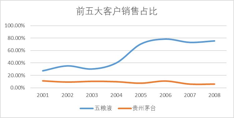我们从同时期的前五大客户占比中就能看出,五粮液在当时渠道扩张的同时,前五大经销商占收入比重2006年达到了78.43%,而同期贵州茅台的前五大经销商占比仅为11%。五粮液的销售渠道命脉基本都掌握在“大商”手里。