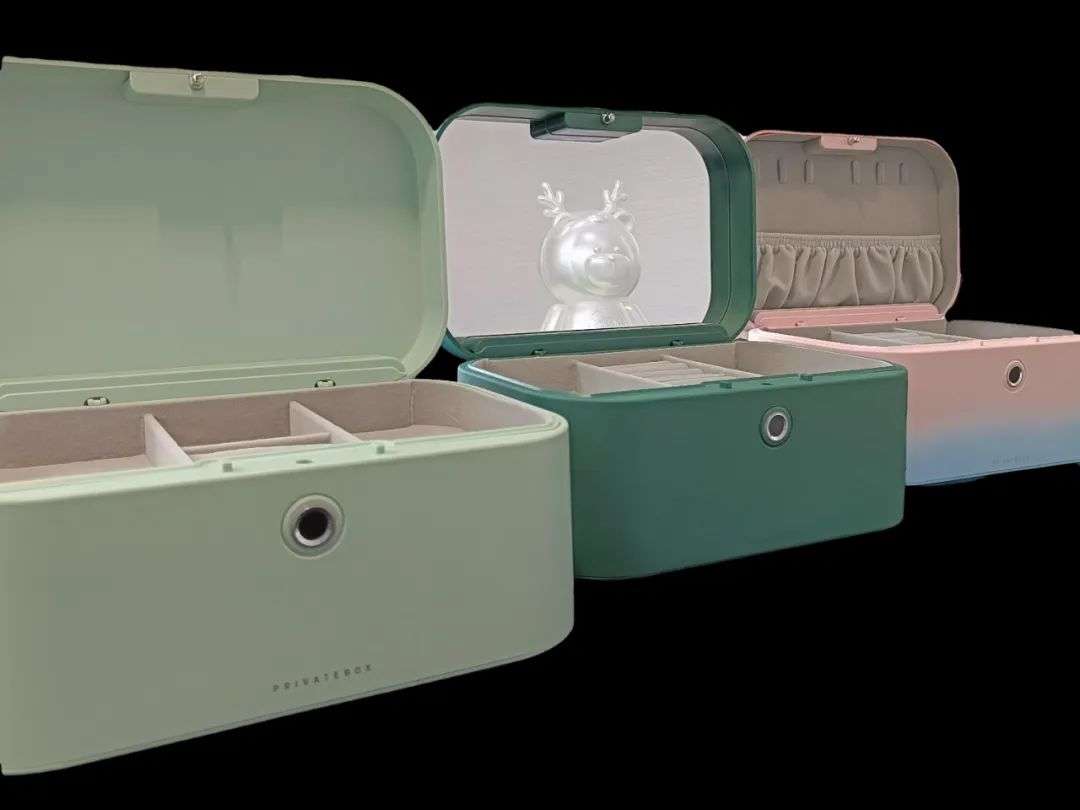 神指宝盒的首饰盒产品一直在升级,从内层包绒布,到安装高清大镜面,再到项链手链挂袋。颜色也从活泼的马卡龙色系,做到了复古的深绿、正红,还联合设计师出了渐变色系。盒身也从半哑光的环保ABS,开始增加丝绒哑光的肤感油工艺。更实用了,也更有品质了。