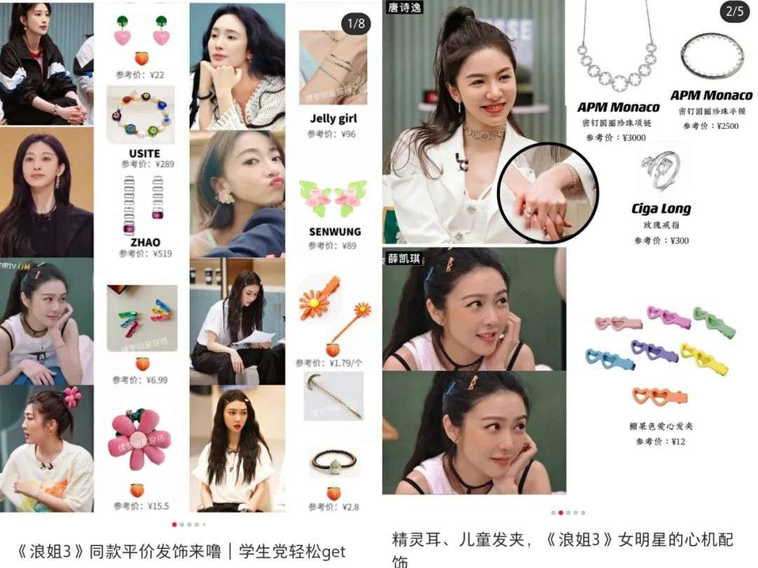 小红书上浪姐3相关笔记已有9800+条,其中扒穿搭的笔记不在少数。让人为之惊喜的是这届姐姐的首饰并没有想象中的高不可攀,不少男生女生都将这些平价同款加入淘宝购物车。
