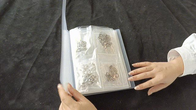 优点:透明塑料材质,收纳清晰,内藏乾坤,内页含有四宫格袋子,一本册子可以装下上百件首饰,贫民窟女孩快乐“翻牌”不是梦!还附带50个密封袋,一袋一首饰,不会混淆,密封防氧化。