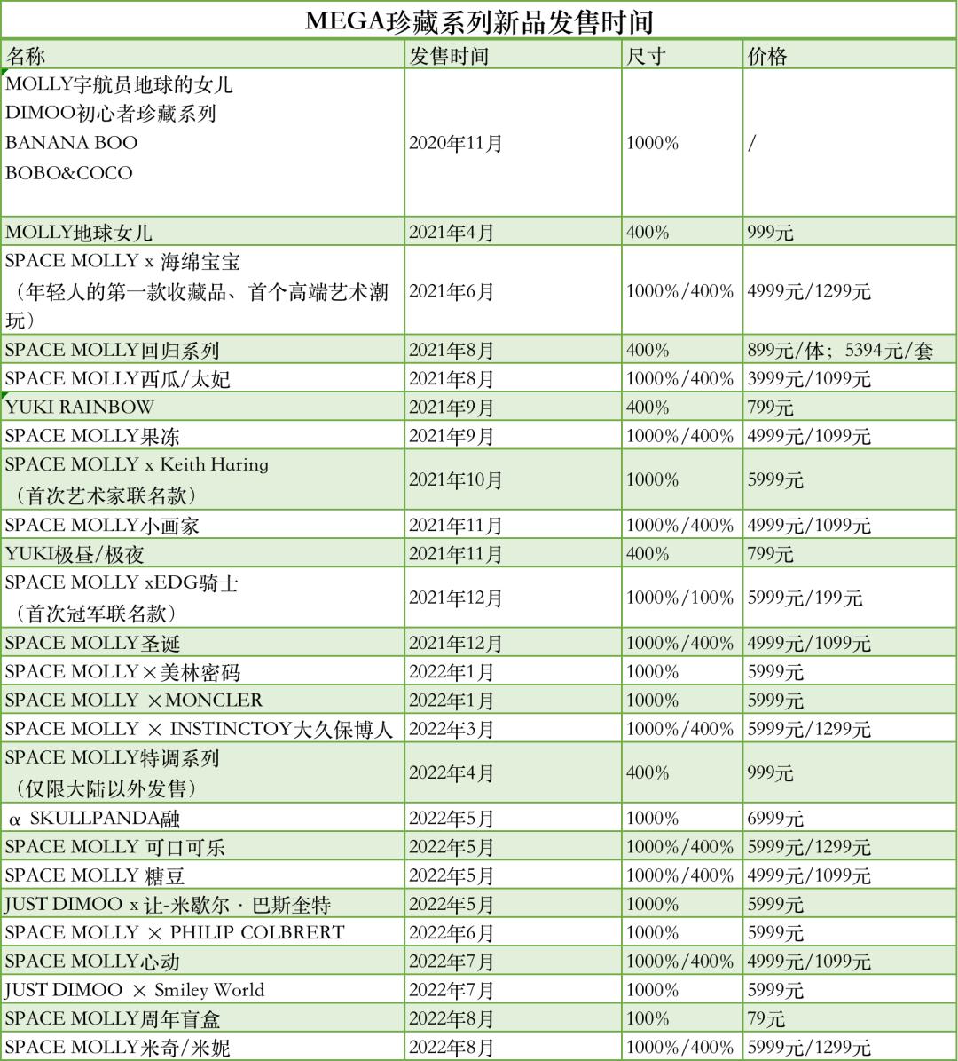 MEGA系列自2021年正式推出以来,已成为发展重点。据《中国企业家》不完全统计,MEGA珍藏系列截至目前共推出25次新品。2021年推出11款新系列;2022年截至8月17日,已宣布发售13款。其中,SPACE MOLLY系列仍旧是推新最多的一个IP,同时也不乏和如可口可乐等知名品牌、艺术家等联名系列。