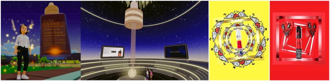 左1、2为雅诗兰黛在虚拟空间推出的NFT小棕瓶右1、2为M.A.C推出的NFT数字藏品