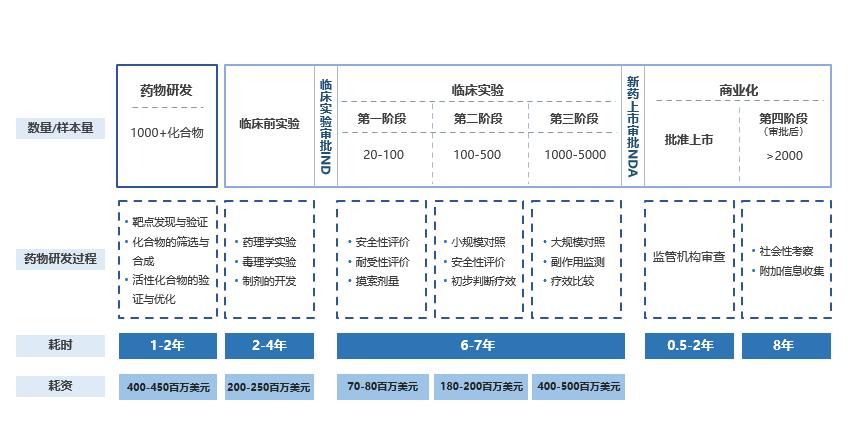 虽然大家都赶时间,但是创新药的研发和商业化,必经四大关键阶段和两大关键审批点,全程费时又费钱: