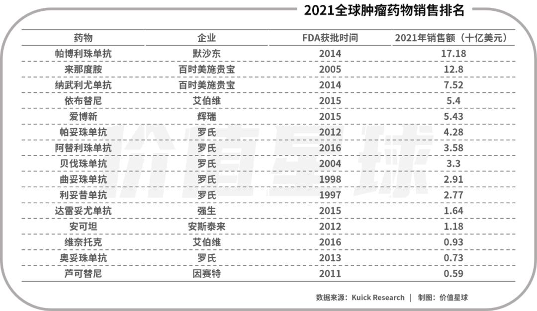 美国前总统卡特在2015年罹患恶性黑色素瘤,就是采用上述的K药进行治疗的,只用了半年多即告康复。彼时K药和O药上市不足一年,对黑色素瘤等的惊人疗效带火了PD-1药物。K药长年在全球最畅销的抗癌药物中排名第一,2021年为默沙东贡献了全年30%以上的营收,年销售额达到171.8亿美元。