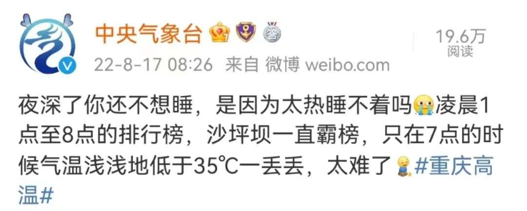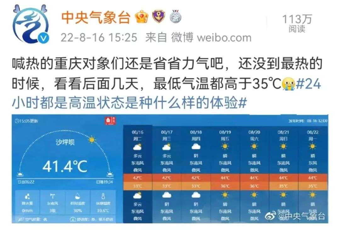 中央气象台也发微博称:重庆沙坪坝只有在早上7点的时候气温“浅浅地低于35度一丢丢”。