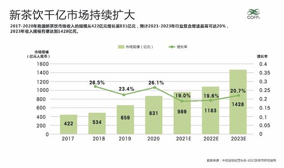 根据第三方数据,截至2020年,国内新式茶饮门店数量约37.8万家,较2019年底的42.7万家与2020年底的59.6万家,数量有所下降,但新式茶饮门店在饮品店大类中占比整体依旧强势,高达65.5%。新式茶饮市场规模稳中有升,2017年—2020年,市场收入从422亿元攀至831亿元,预计到2023年有望达到1428亿元。