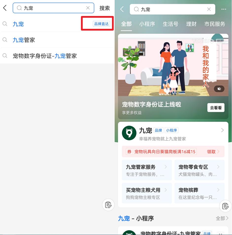 去年12月,支付宝“生活号”升级,新增App首页“生活”频道。此前,“生活号”的入口在支付宝底栏的第四个tab页“消息”的二级目录中。徐桦透露,这和九宠将自有流量沉淀到小程序不同,是一条更为令人遐想的“从公域导入私域”的路径。此外,今年以来,在支付宝搜索品牌,结果页里也会出现一个“动态”栏,呈现的是来自该品牌生活号里的短视频种草内容。