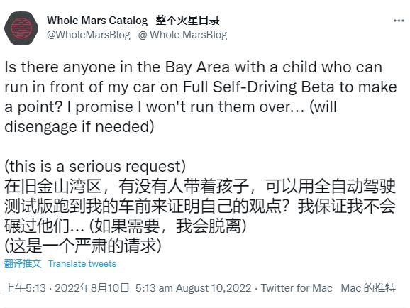 推特汽车博主 @WholeMarsBlog 发了条推特,呼吁开特斯拉的家长们,把活的孩子站在路中间测试。