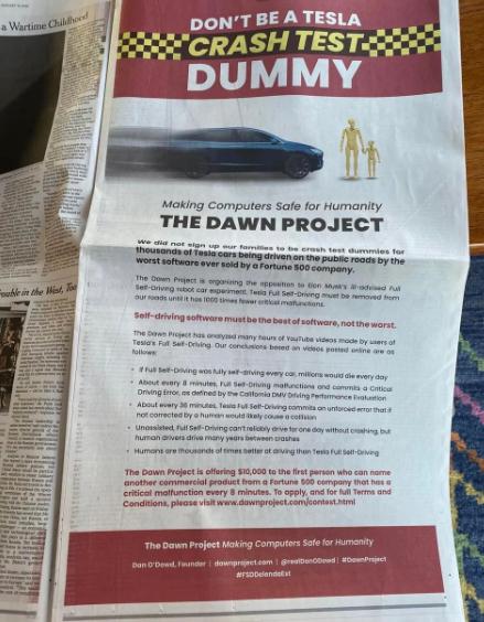 黎明计划还算出一个结果,特斯拉的 FSD 在城市道路上每 8 分钟就会出现一次事故,而且还把这个结果印成报纸,在美国 36 个州的主流媒体刊登,散发。