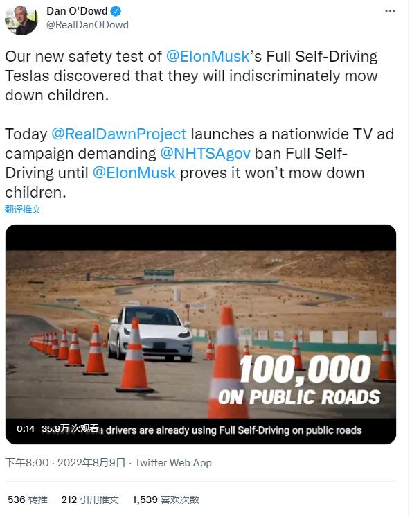 并且他们呼吁国会,完全禁止掉特斯拉。就连前美国总统候选人 Ralph Nader 还引用上述数据发了条推特,为丹站台。