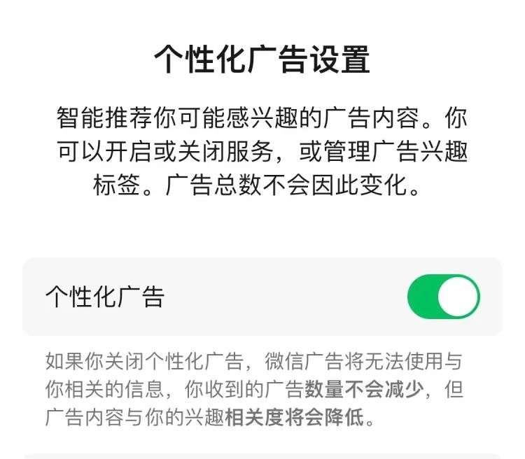 并且这样的政策目前已经更新,现在朋友圈广告已经不能被关闭,微信唯一的让步是可以关闭个性化推荐,并且在解释中加粗提醒了用户收到的“广告数量不会减少”。