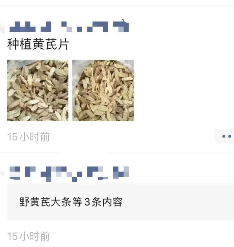 这条朋友圈下面,另一个人连着发了三条卖老家黄芪的动态,但这三条朋友圈被默默折叠了,折叠到只剩“xxx等三条内容”这一句话。