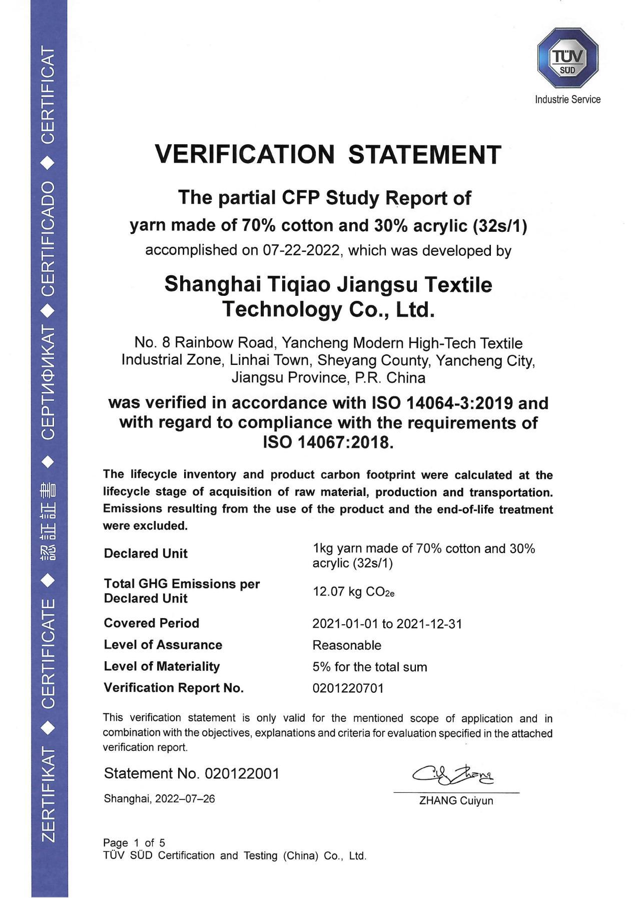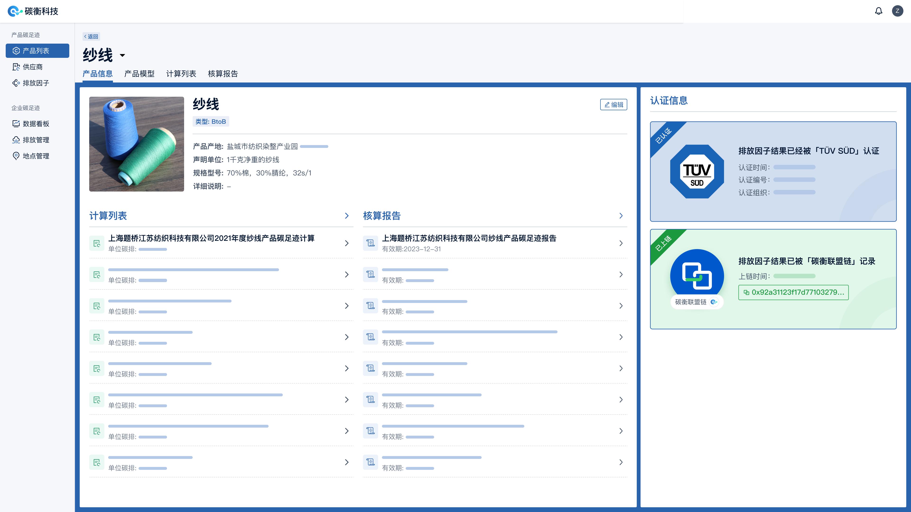 解决了数据获取的自动化、即时性、公正性后,针对上海题桥工厂的碳减排认证,碳衡科技联合TÜV SÜD南德意志集团,出具了全球首例区块链上链的混纺纱线产品碳足迹证明。