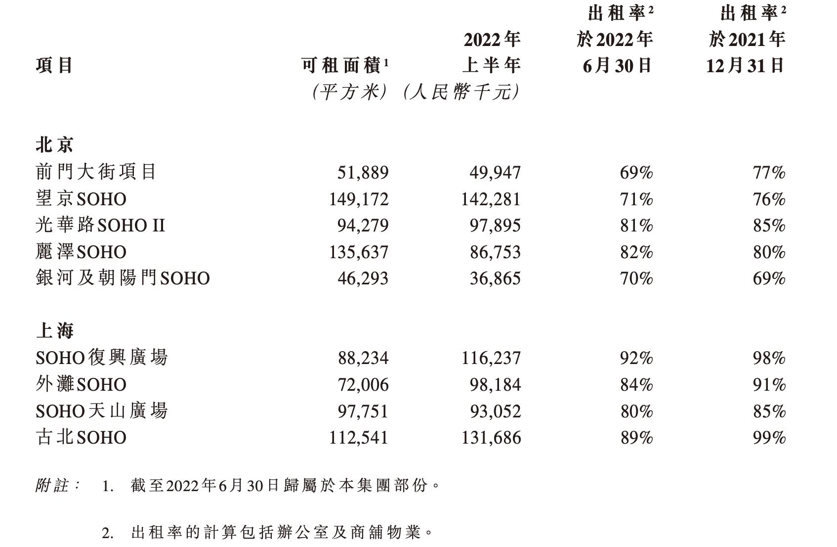 受今年上半年新冠疫情的影响,北京及上海办公楼租赁市场承压。截至2022年上半年,SOHO中国投资物业平均出租率为80%,去年同期出租率约为90%。