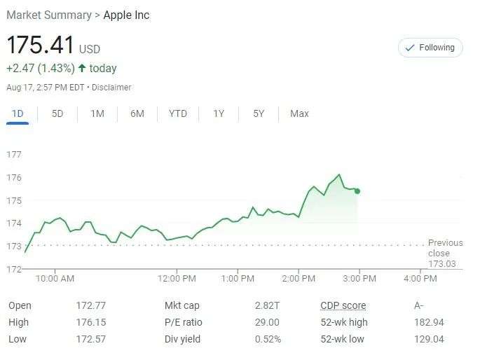 苹果股价周三逆市上涨,发布会相关报道传出后触及日高,最高涨1.8%,至四个半月最高,接近收复4月4日来全部跌幅。