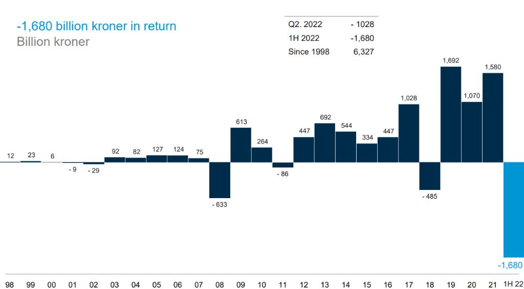 8月17日,挪威银行投资管理公司公布其2022年上半年业绩。结果显示,挪威主权财富基金在今年上半年亏损了14.4%,亏损金额高达1.68万亿挪威克朗(合1740亿美元),打破了其在金融危机期间的亏损纪录。