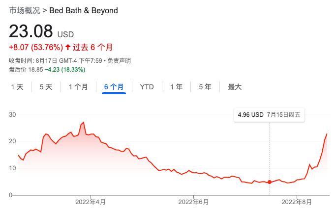 而最近一个月,BBBY狂涨了365%。上周一,BBBY盘中曾涨超60%;8月16日周二盘中涨近80%,股价跃升至每股27美元以上。