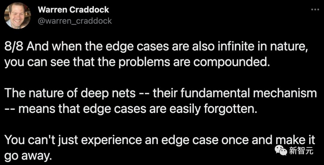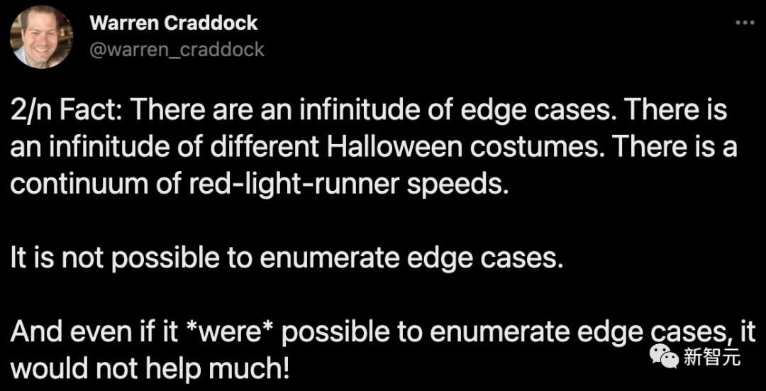 这仍然是核心问题。直到最近几年,无人驾驶汽车行业才意识到这个现实。正如 Waymo AI/ML 工程师 Warren Craddock 最近在一个应该完整阅读的 线程中所说的那样: