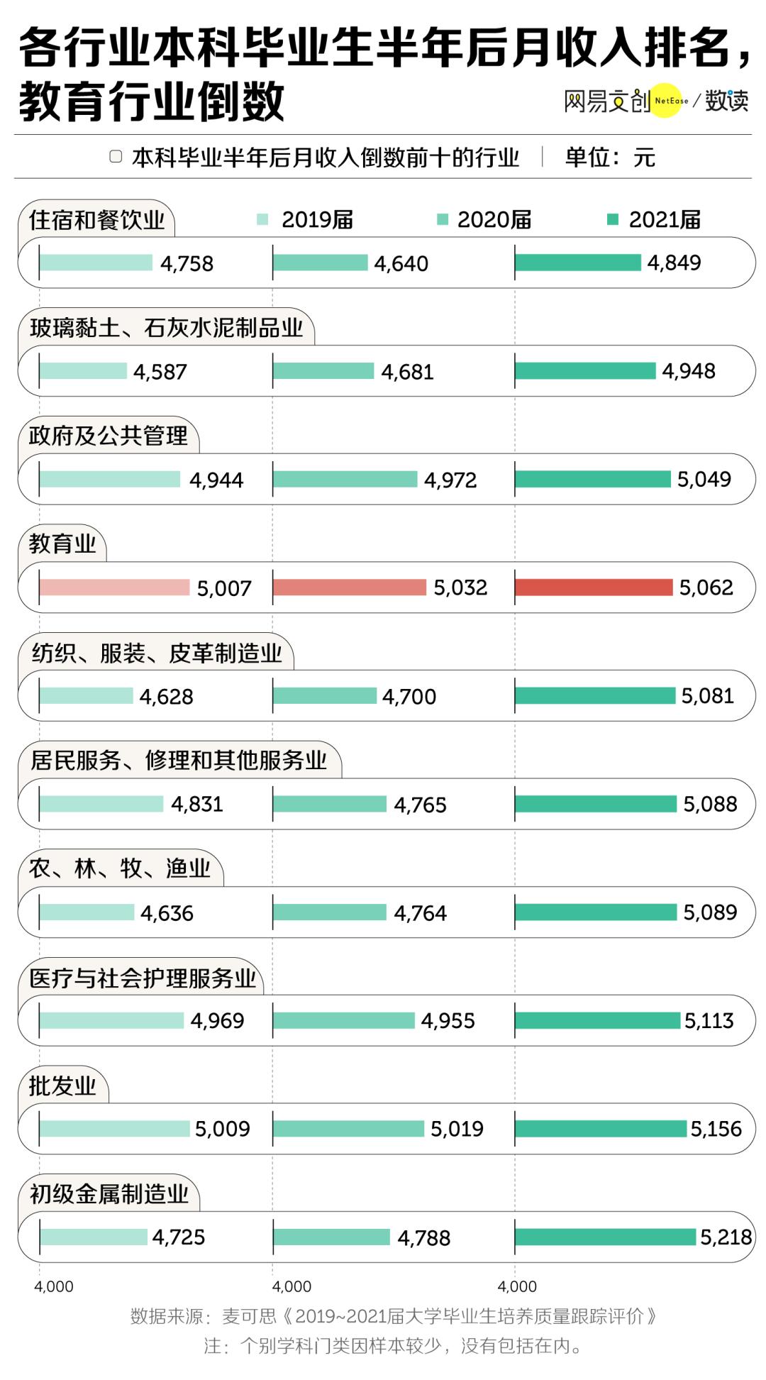 根据麦可思研究院,2021 届本科生毕业半年后在主要行业的月收入中,教育业倒数第四,收入增长也常年倒数 [11]。