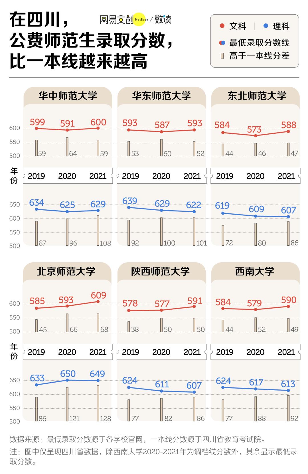 我们统计了六所教育部直属师范大学在四川近三年公费师范生的最低录取分数,结果显示,六所名牌师范在四川的分数线和一本线之间的分差大部分都变大了。
