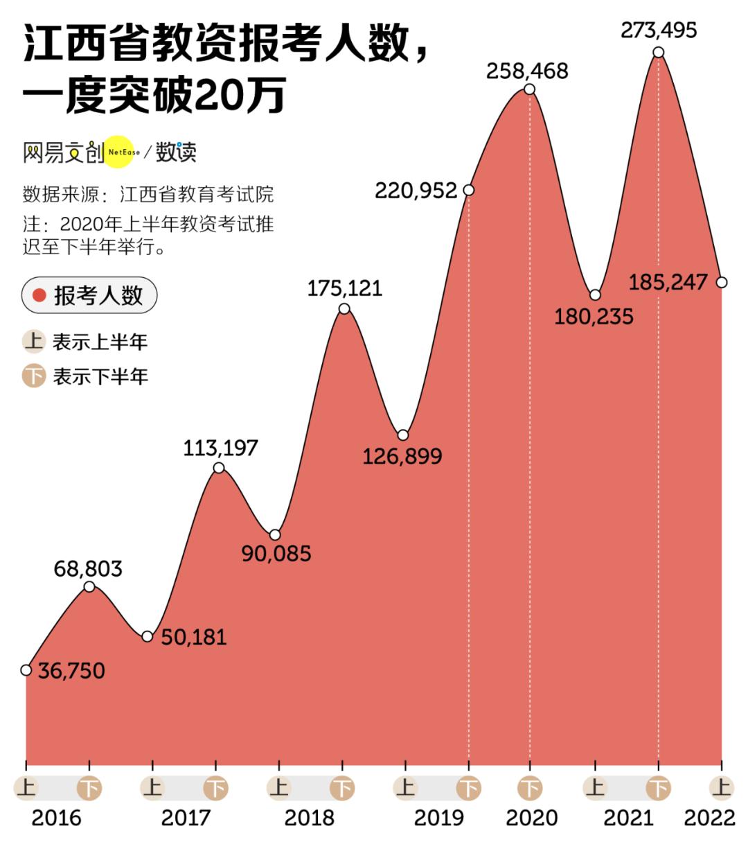 就拿江西来看,6 年前一场考试还只有 3 万多人报名,2017 年就突破了 10 万大关,两年后更是翻倍到 20 万。
